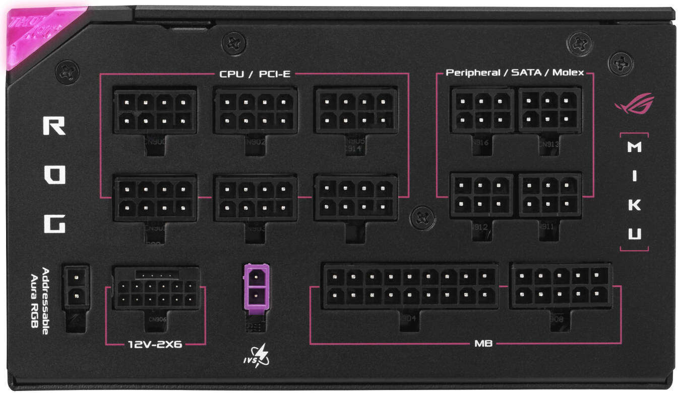 ATX 3.1 compatible: ROG Thor Platinum III Hatsune Miku Edition is compliant with the ATX 3.1 standard, ensuring enhanced voltage and current regulation for the latest hardware.