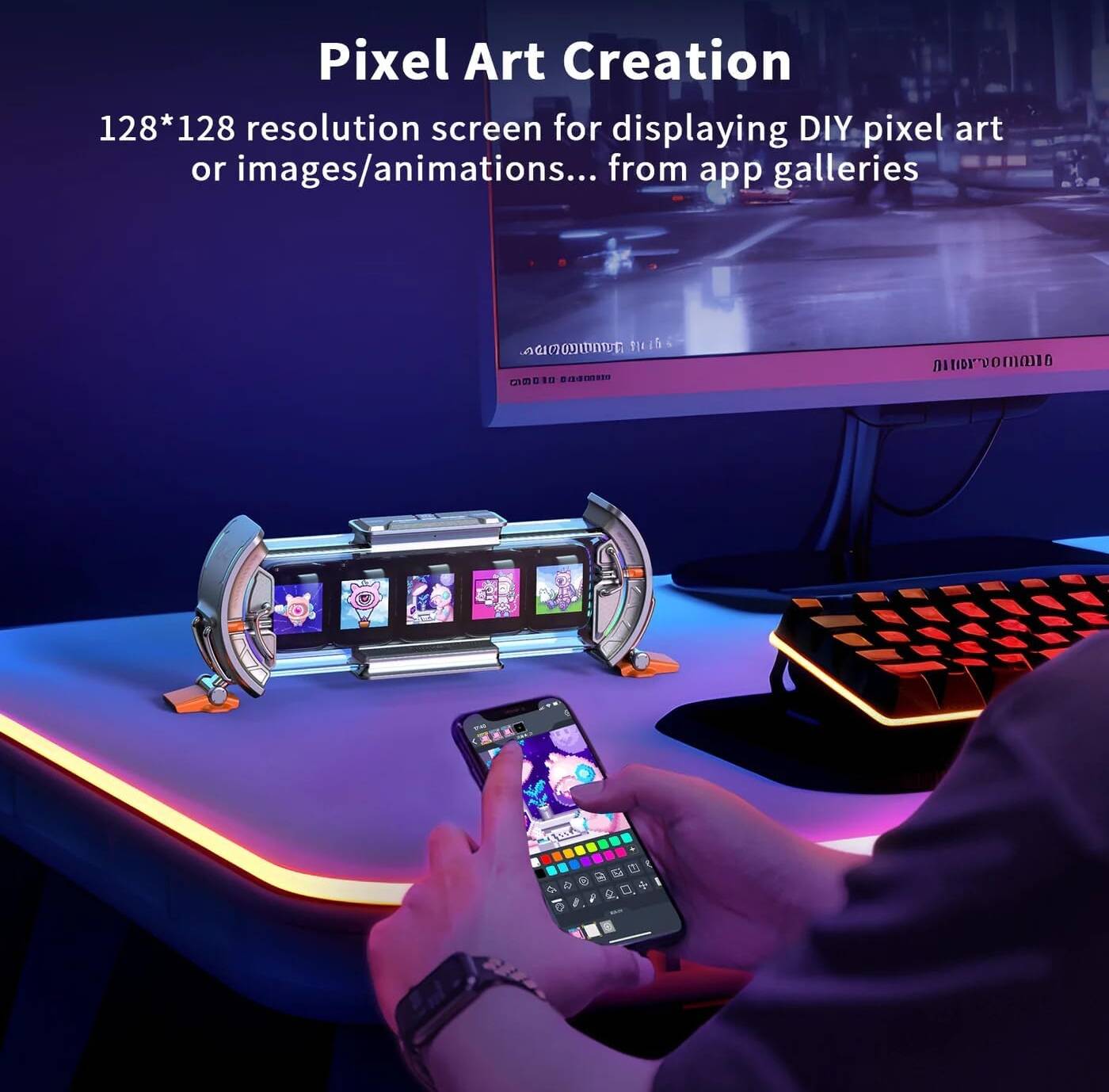 Screens can display up to 128 by 128 pixel art static pictures and gifs