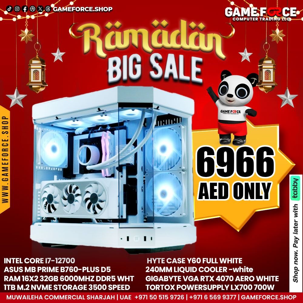 INTEL CORE I7-12700 ASUS MB PRIME B760-PLUS D5 TFORCE RAM 16X2 32GB 6000MHZ DDR5 WHT LEXER 1TB M.2 NVME STORAGE 3500 SPEED HYTE CASE Y60 FULL WHITE 240MM LIQUID COOLER -white GIGABYTE VGA RTX 4070 AERO WHITE TORTOX POWERSUPPLY LX700 700W
