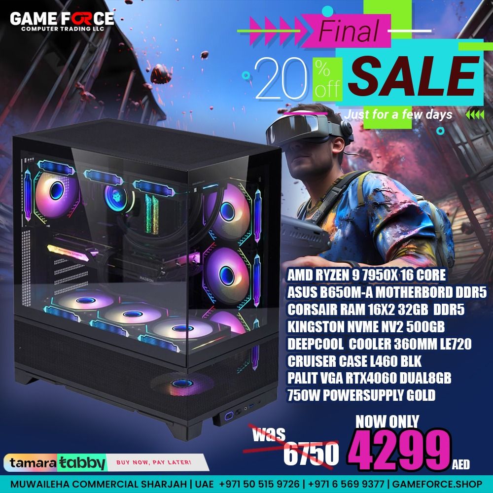 AMD RYZEN 9 7950X 16 CORE ASUS B650M-A MOTHERBORD DDR5 V COLOR RAM 16X2 32GB 5600MHZ BLK DDR5 KINGSTON NVME NV2 500GB DEEPCOOL LIQUID COOLER 360MM LE720 BLACK CRUISER CASE L460 BLK PALIT VGA RTX4060 DUAL8GB XIGMATEC 750W POWERSUPPLY GOLD