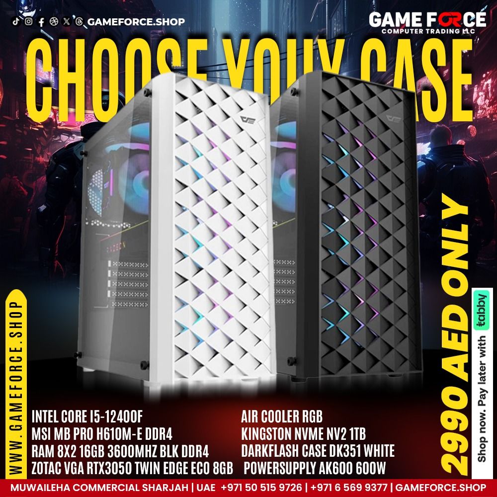 INTEL CORE I5-12400F MSI MB PRO H610M-E DDR4 V COLOR RAM 8X2 16GB 3600MHZ BLK DDR4 ZOTAC VGA RTX3050 TWIN EDGE ECO 8GB AIR COOLER RGB KINGSTON NVME NV2 1TB DARKFLASH CASE DK351 WHITE POWERSUPPLY AK600 600W