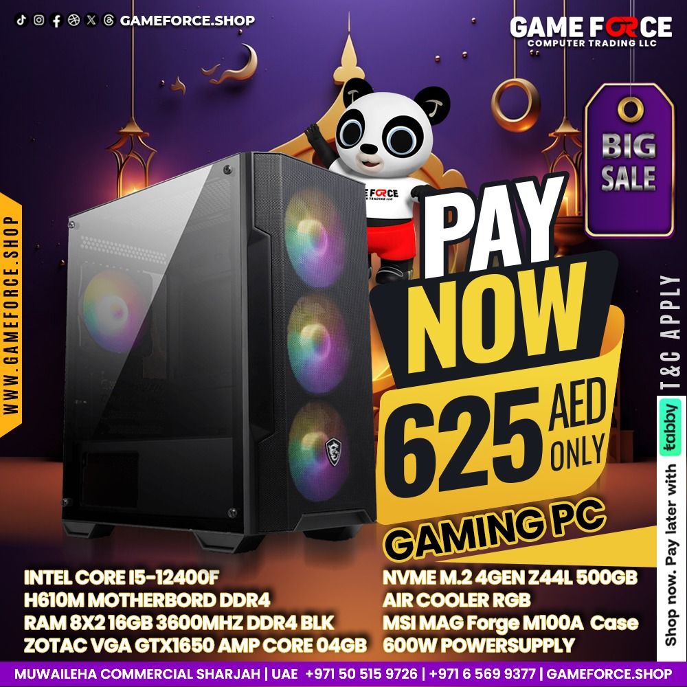 INTEL CORE I5-12400F H610M MOTHERBORD DDR4 TEAMGROUP RAM 8X2 16GB 3600MHZ DDR4 BLK ZOTAC VGA GTX1650 AMP CORE 04GB T-FORCE NVME M.2 4GEN Z44L 500GB AIR COOLER RGB MSI MAG Forge M100A Gaming Case 600W POWERSUPPLY