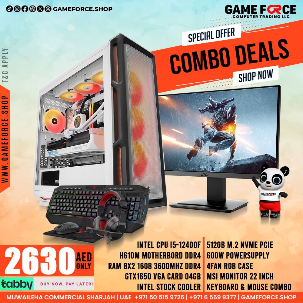 INTEL CPU I5-12400F H610M MOTHERBORD DDR4 TEAMGROUP RAM 8X2 16GB 3600MHZ DDR4 BLK GTX1650 VGA CARD 04GB INTEL STOCK COOLER 512GB M.2 NVME PCIE 600W POWERSUPPLY 04FAN RGB CASE MSI MONITOR MP223 FHD 100HZ 22 INCH KEYBORD MOUSE HEADSET MOUSEPAD GAMING
