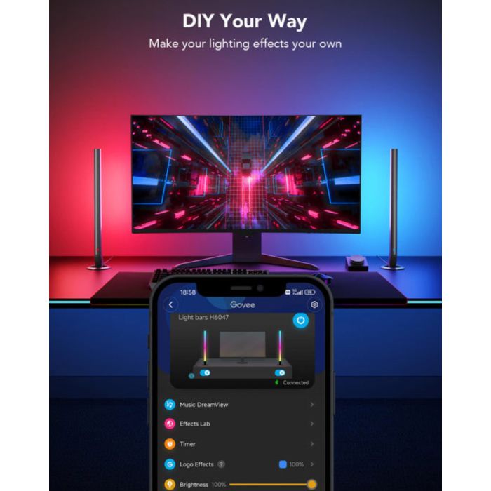 Description for Govee RGBIC Wi-Fi Gaming Light Bars, Smart Dial Controller, RGBIC Technology, 2.4GHz Wi-Fi + Bluetooth Connectivity, 40 Scene Modes | H6047281