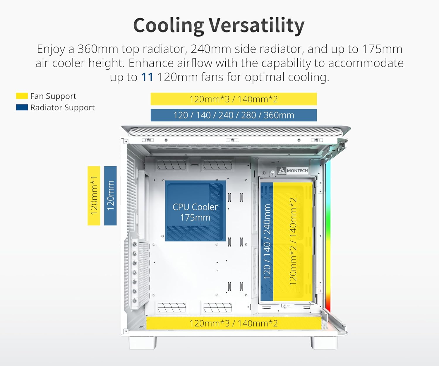 MONTECH, KING 95 PRO Dual-Chamber ATX Mid-Tower PC Gaming Case, High-Airflow, Toolless Panels, Sturdy Curved Tempered Glass Front, Six ARGB PWM Fan Pre-installed with Fan Hub, White