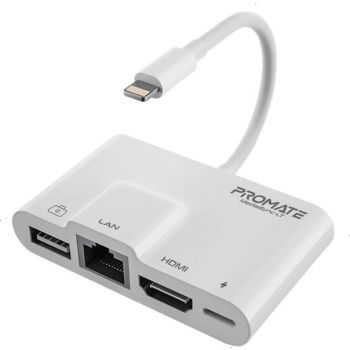 Promate Lightning Hub, 4-in-1 Premium Multimedia Adapter with 1080p HDMI Port, 10/100 Mbps RJ45 Ethernet Port, Quick Data Transfer USB Port and Lightning Charging Port for iPhone 13, MediaSync-LT