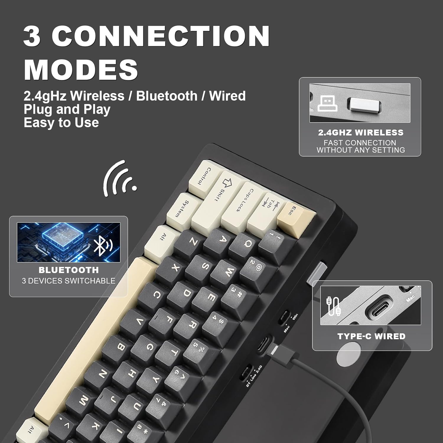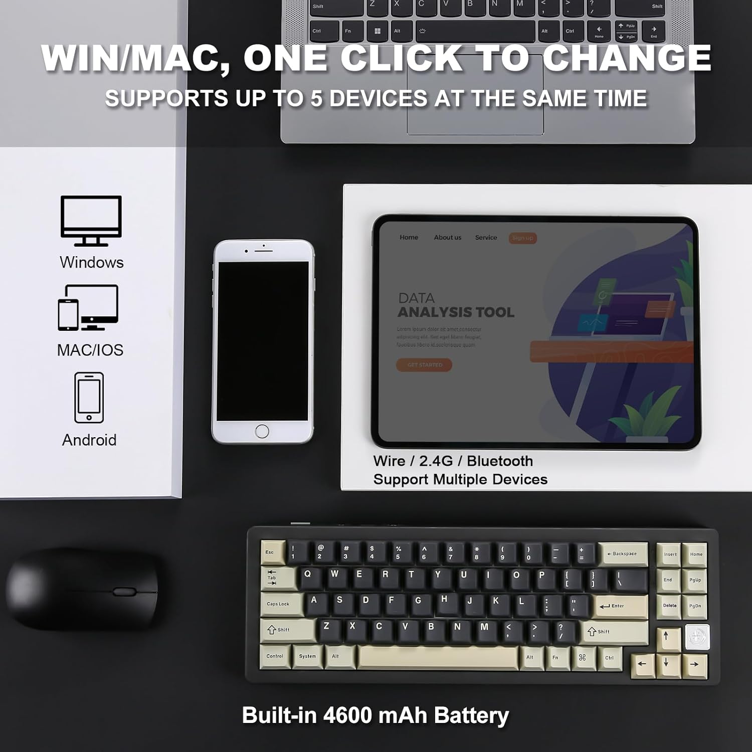 About this item ã€Premium Design with CNC Aluminium Frame 】The YUNZII AL71 is a custom mechanical keyboard to push your typing experience to the top.With aluminum CNC machined body and gasket structure,the AL71 is designed for premium typing comfort and top quality.The CNC aluminum keyboard takes Anodic Oxidation that can not only guarantee the colors long-lasting, but making the gaming keyboard durable and corrosion-resistant, and oxidation-resistant, providing a better typing experience. ã€68% 71 Keys Mechanical Keyboard with Wireless/Wired】This hot swappable keyboard With built-in 4600mAh battery,this mechanical keyboard supports BT,2.4GHz and wired connection.No fussy connection steps,just toggle the side button to change the connection modes.Quickly switch between wireless connections on your PC,Mac,and more at the press of FN+Q/W/E.YUNZII AL71 portable keyboard frees up your desk during work,gaming,or carrying out. 2.4G wireless dongle and wired type c cable are included. ã€Hot Swap Gasket Mount Keyboard】Elevte typing experience with AL71, which utilizes a high-quality gasket material to absorb vibrations and eliminate any noise.The gaming keyboard supports 3-pin and 5-pin mechanical switches.Equipped with poron sandwich foam,poron socket foam,PET sound pads,and PBT keycaps,the solid 65% keyboard provides exceptional pleasant typing feeling,ideal for professionals who demand custom keyboard fun,superb quality,and top comfort. ã€NKRO&South-facing LED】YUNZII AL71 gaming keyboard With N-key rollover, the ergonomic keyboard can respond to the simultaneous press of multiple keys, helpful for using hotkeys and real-time games.With 14 default light patterns and 8 backlight colors,the RGB keyboard takes south-facing LED,which better illuminate the keyboard and light up gaming accessories. The side RGB and metal badge design brings more fun on this keyboard. You can easily change RGB with simple shortcuts. ã€Custom MX Switches,Mac & Win Double Layout】The AL71 TKL keyboard go with custom switches, factory pre-lubed Crystal white switch and silent switch. 50-million-keystroke lifespan. The crystal white switch is linear switch that provides a more smooth typing experience. The silent switch is dedicated for low typing noise users, smooth linear travel with softer force required. The AL71 TKL keyboard is compatible with Laptop,iPad,IOS,Windows,Mac or Android, compatible with both Windows and MacOS.