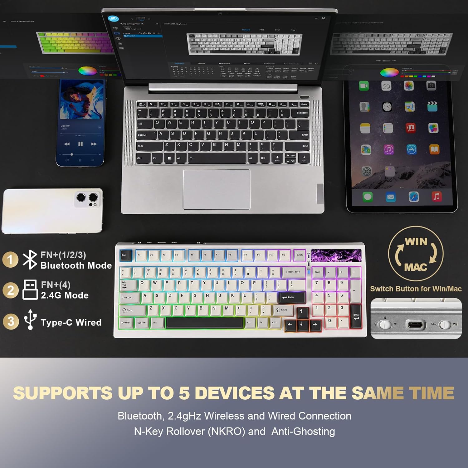 ã€Tri-mode Wireless Connectivity + Multi-Device Connection】Built-in 4600mah large-capacity battery , the YZ98 wireless keyboard has Blutooth, 2.4gHz wireless and wired connection. Compatible with Laptop, iPad, IOS, Windows, Mac or Android. No fussy connection process, the wireless connection is quick and stable. The fast 2.4gHz wireles mode has the polling rate up to 1000hz.